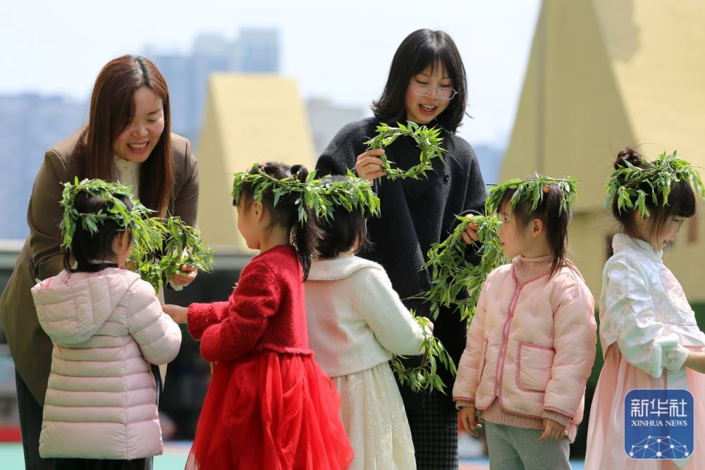 ↑ 4月3日,四川省樂山市瑞錦幼兒園小朋友和老師一起制作柳帽。新華社發(fā)(李華時(shí)攝)