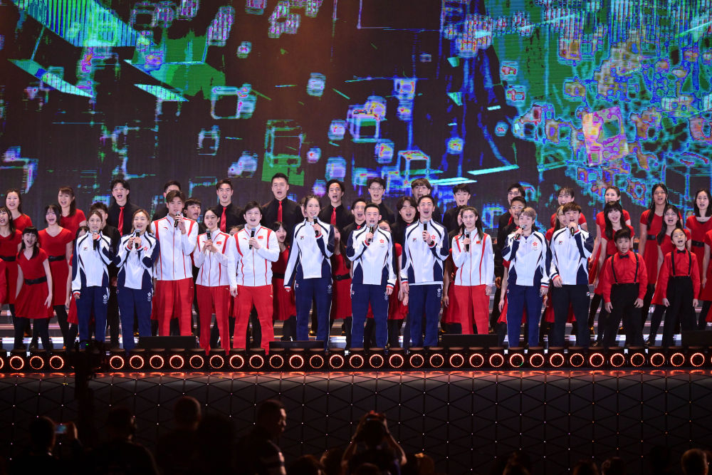 3月1日,在香港啟德體育園開幕典禮上,內(nèi)地與香港運動員代表合唱歌曲。新華社記者 朱煒 攝