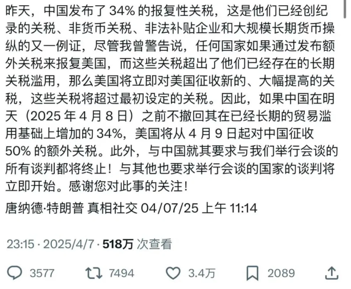 一覺(jué)醒來(lái),特朗普再發(fā)威脅,警告中國(guó)在4月8號(hào)前取消報(bào)復(fù),不然4月9號(hào)就對(duì)中國(guó)再加50%額外關(guān)稅,此外所有和中國(guó)的談判都會(huì)中止,而和其他國(guó)家的談判將立即開始。
