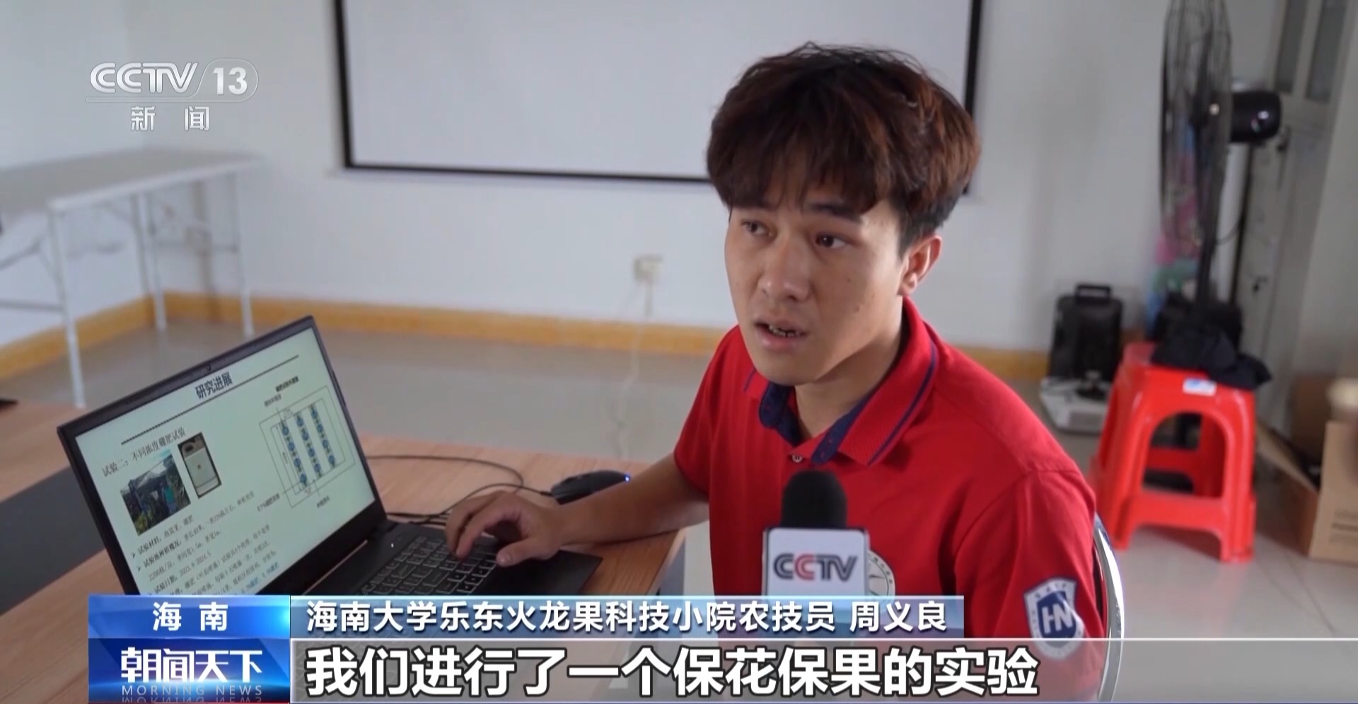 海南大學(xué)樂東火龍果科技小院農(nóng)技員 周義良:根據(jù)這個(gè)現(xiàn)狀,我們進(jìn)行了一個(gè)?;ū9膶?shí)驗(yàn),通過不同濃度的硼肥、氨基酸肥、授粉和溫度調(diào)控來進(jìn)行實(shí)驗(yàn),坐果率提升了20%左右。