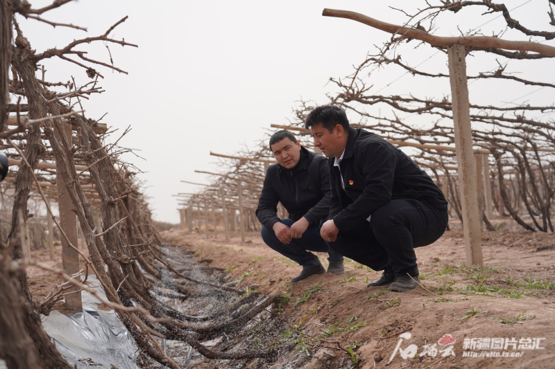 4月7日,在鄯善縣吐峪溝鄉(xiāng)洋海夏村葡萄地,村民艾海提·買買提(左)與村干部查看微噴灌管網(wǎng)水壓。加帕爾攝