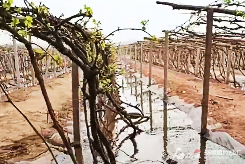 2022年,鄯善縣魯克沁鎮(zhèn)迪汗蘇村葡萄地在采用高效節(jié)水灌溉之前,大水漫灌的場(chǎng)景。熱杰甫·吐爾遜 攝