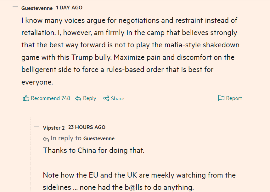 中國(guó)的嚴(yán)正立場(chǎng)也引發(fā)了同樣受到美國(guó)關(guān)稅影響的各國(guó)網(wǎng)民對(duì)中國(guó)的廣泛支持。在英國(guó)《金融時(shí)報(bào)》相關(guān)報(bào)道評(píng)論區(qū),獲贊最多的一條網(wǎng)友評(píng)論稱(chēng):“我知道有許多聲音主張通過(guò)談判和克制來(lái)解決問(wèn)題,而不是采取反制行動(dòng)。然而,我強(qiáng)烈認(rèn)為最好的前進(jìn)方式就是將好戰(zhàn)一方的痛苦和不適最大化,如此才能建立一個(gè)對(duì)所有人都有利的基于規(guī)則的秩序?!?/p>