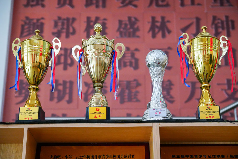 ↑這是4月14日在新疆克孜勒蘇柯?tīng)柨俗巫灾沃莅D什市硝魯克中學(xué)拍攝的獎(jiǎng)杯。新華社記者 徐宏巖 攝