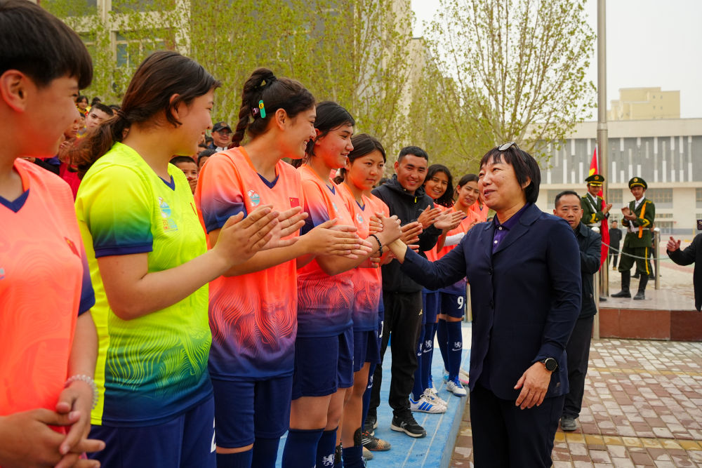 ↑4月12日,2025新疆克孜勒蘇柯?tīng)柨俗巫灾沃葑闱蚵?lián)賽開幕式后,中國(guó)足協(xié)副主席、前中國(guó)國(guó)家女子足球隊(duì)球員孫雯(前右一)與阿圖什市U13女子足球隊(duì)隊(duì)員阿依謝·托乎達(dá)洪(左三)交流。新華社記者 徐宏巖 攝