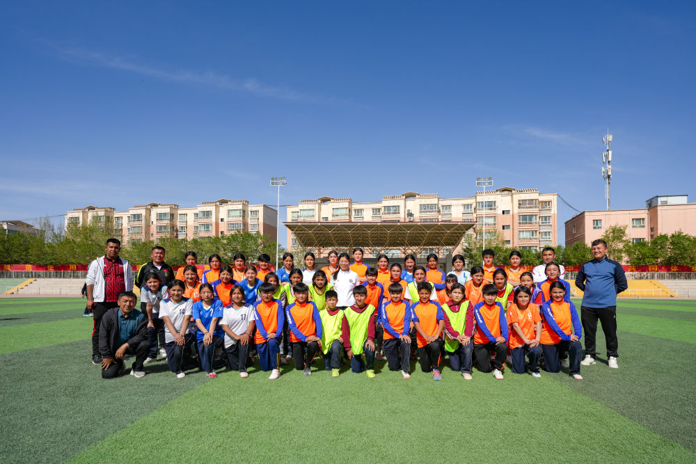 ↑4月12日,在2025新疆克孜勒蘇柯?tīng)柨俗巫灾沃葑闱蚵?lián)賽開幕式后,中國(guó)足協(xié)副主席、前中國(guó)國(guó)家女子足球隊(duì)球員孫雯(前)與阿圖什市U13女子足球隊(duì)合影。新華社記者 徐宏巖 攝