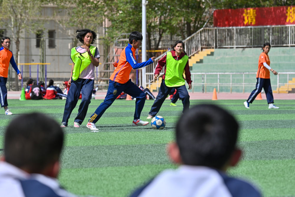 ↑4月10日,在阿圖什市硝魯克中學(xué),球隊(duì)中場(chǎng)球員帕提麥·肉孜買買提(左)在進(jìn)行運(yùn)球訓(xùn)練。新華社記者 徐宏巖 攝