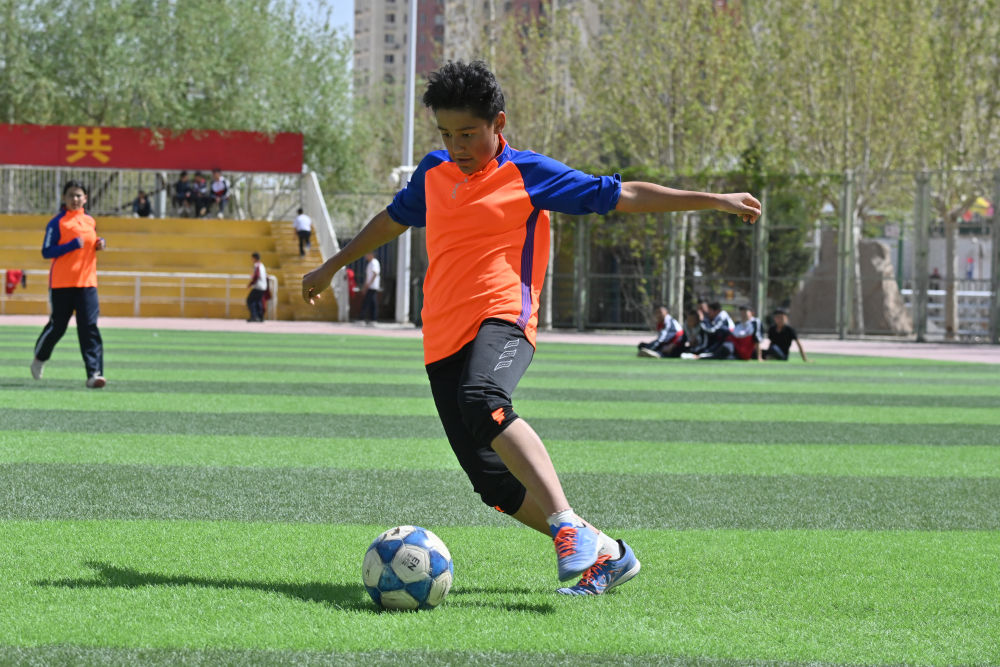 ↑在阿圖什市硝魯克中學(xué),球隊(duì)前鋒謝爾克努爾·亞力坤在訓(xùn)練賽中帶球進(jìn)攻。新華社記者 徐宏巖 攝