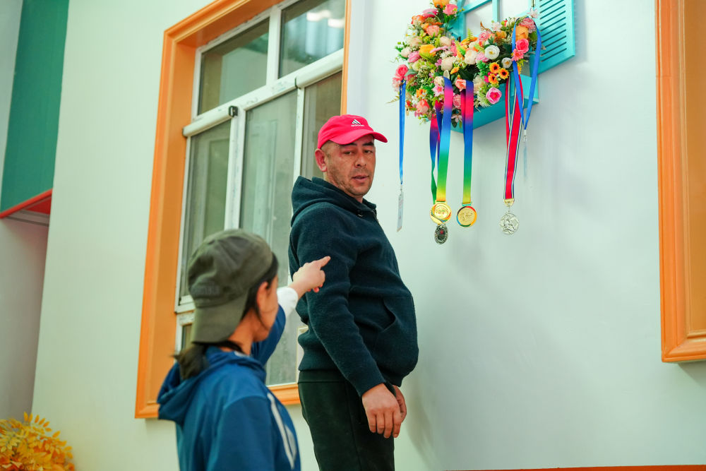 ↑4月13日,在阿圖什市亞喀巴格村,乃菲賽的父親幫女兒整理獎(jiǎng)牌和參賽證件。新華社記者 徐宏巖 攝
