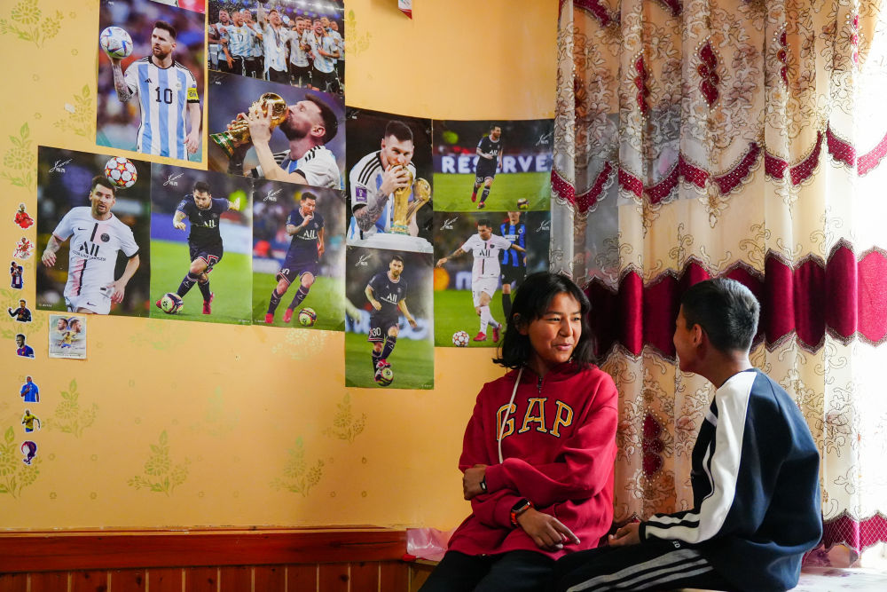 ↑4月13日,在阿圖什市亞喀巴格村,艾妮再(左一)在家中與弟弟聊天。新華社記者 徐宏巖 攝