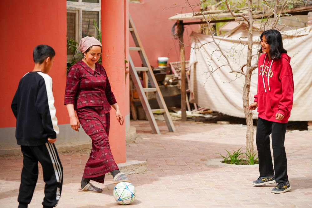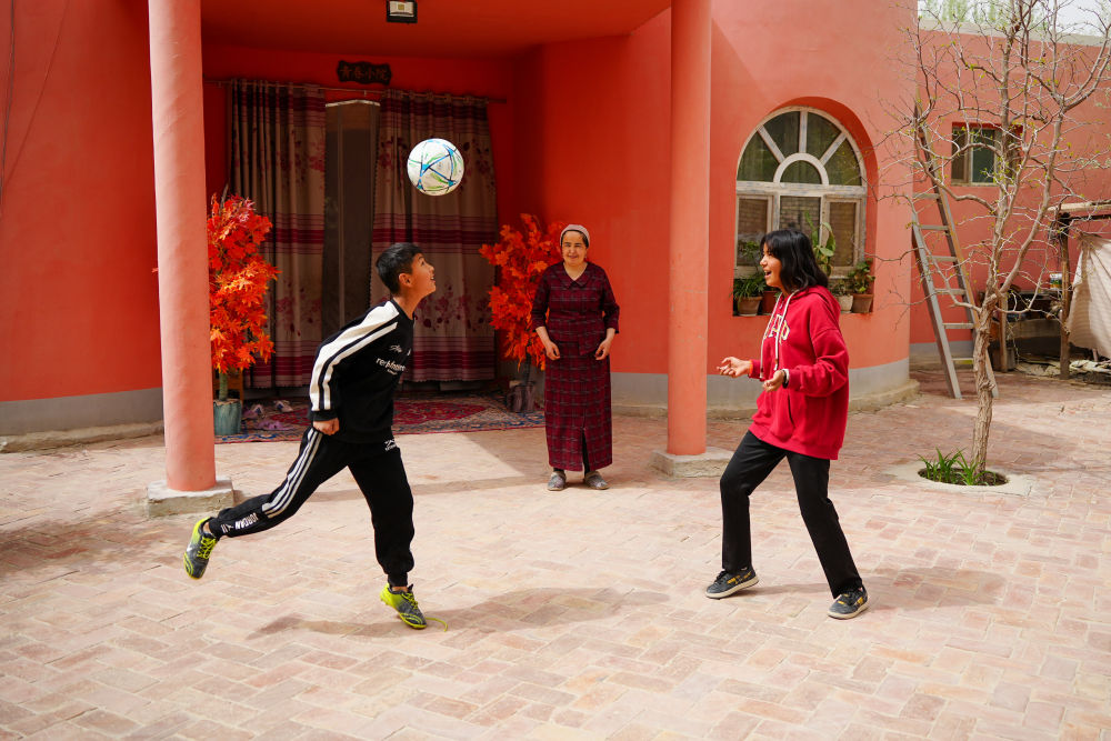 ↑4月13日,在阿圖什市亞喀巴格村,艾妮再(右)在家中的院子里和母親、弟弟一起踢球。新華社記者 徐宏巖 攝