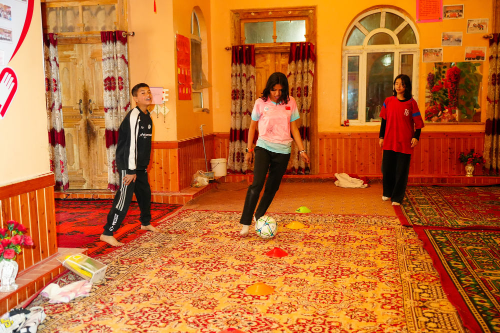 ↑4月13日,在阿圖什市亞喀巴格村,艾妮再(中)在家中與弟弟和朋友比拼帶球技術(shù)。新華社記者 徐宏巖 攝