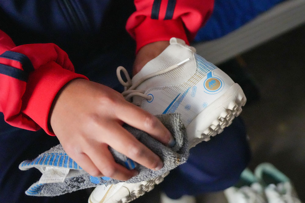 ↑4月10日,在阿圖什市硝魯克中學(xué)宿舍,一名球隊(duì)球員在擦拭自己心愛(ài)的球鞋。球員們的裝備由學(xué)校免費(fèi)發(fā)放。新華社記者 徐宏巖 攝