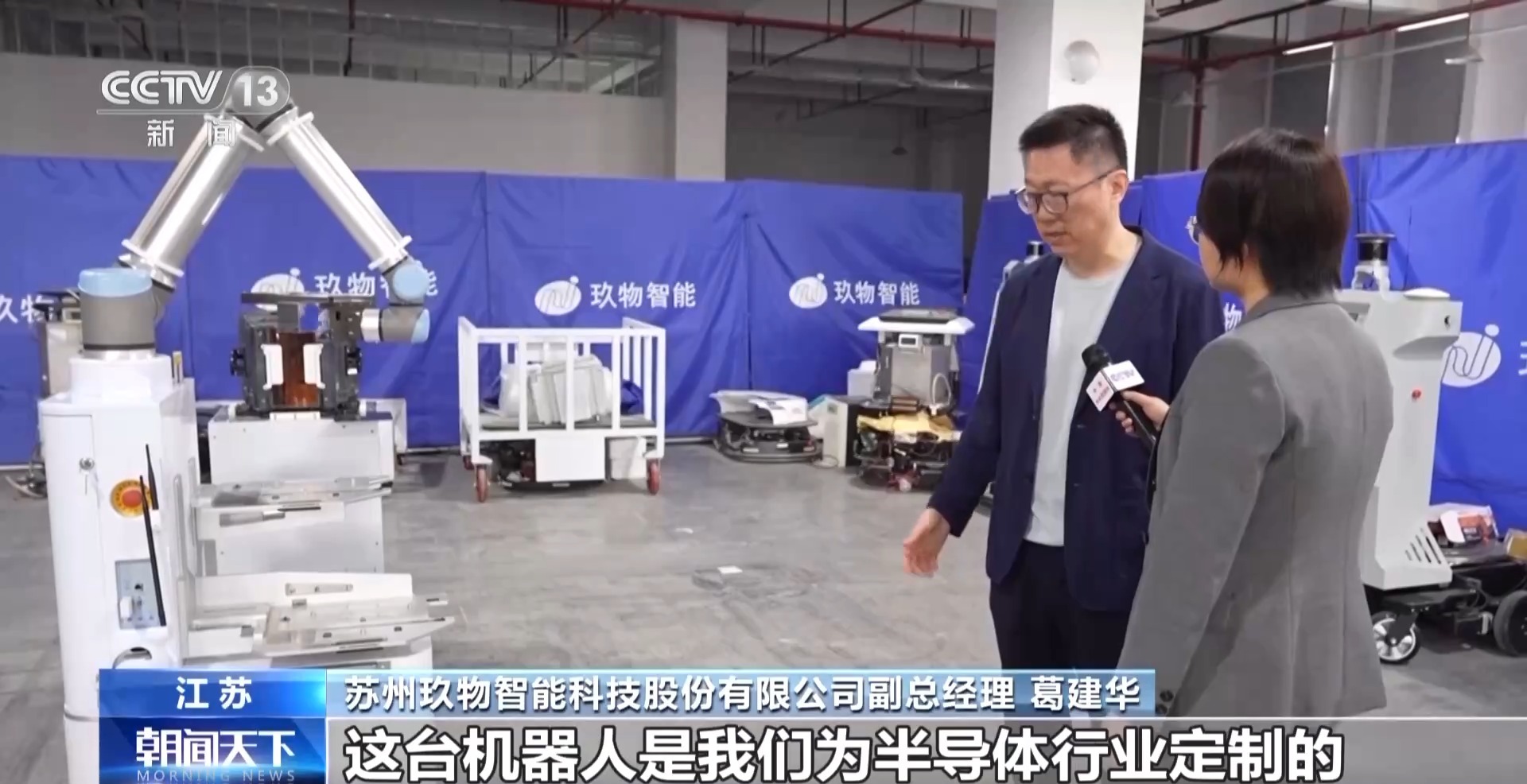 蘇州玖物智能科技股份有限公司副總經(jīng)理 葛建華:這臺機器人是我們?yōu)榘雽w行業(yè)定制的。我們現(xiàn)在抓取的這個設(shè)備,其實是一臺晶圓盒,這個晶圓片模型其實特別薄、特別脆,震動稍微厲害一點就會有裂痕,機械臂的精度可以達到0.1毫米。