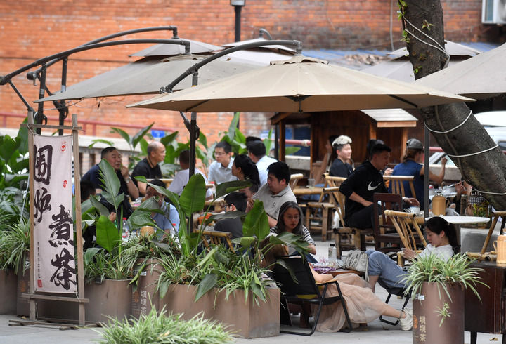4月16日,消費(fèi)者在重慶市九龍坡區(qū)謝家灣街道民主村社區(qū)一茶飲店休閑。周邦靜攝