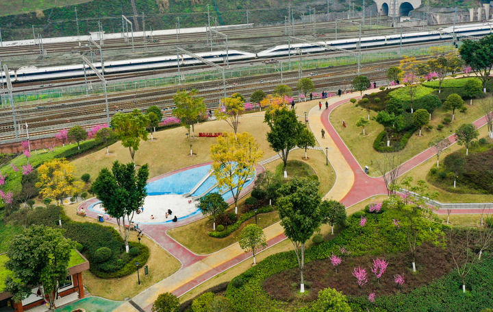 陽(yáng)春三月、百花爭(zhēng)艷,兩江新區(qū)木桃路社區(qū)公園因靠近鐵路,形成了“開往春天的列車”的獨(dú)特景觀,引來不少市民拍照?!斑^去這里是個(gè)建筑棄渣場(chǎng),社區(qū)周邊沒有休閑的地方。經(jīng)改造變成了高低錯(cuò)落的山地公園,兒童樂園、健身步道、飲水等設(shè)施都有,我們現(xiàn)在散步健身有了好地方?!弊≡诟浇泥u女士滿意地說。