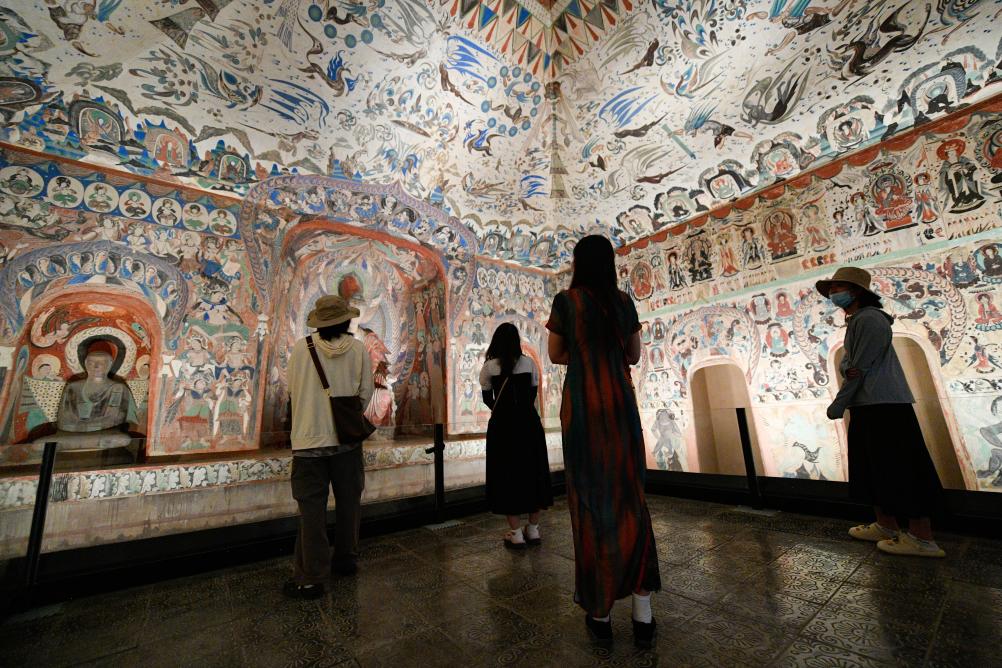 2024年6月7日,在敦煌石窟文物保護(hù)研究陳列中心,游客參觀莫高窟復(fù)制洞窟第276窟壁畫。 新華社記者 郎兵兵 攝
