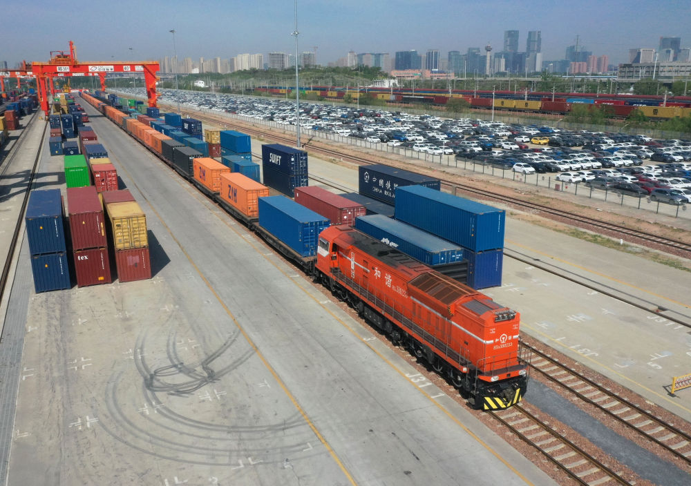 2025年4月15日,X8003次中歐班列(鄭州)??吭趪F集團鄭州局圃田車站(無人機照片)。新華社記者 李嘉南 攝