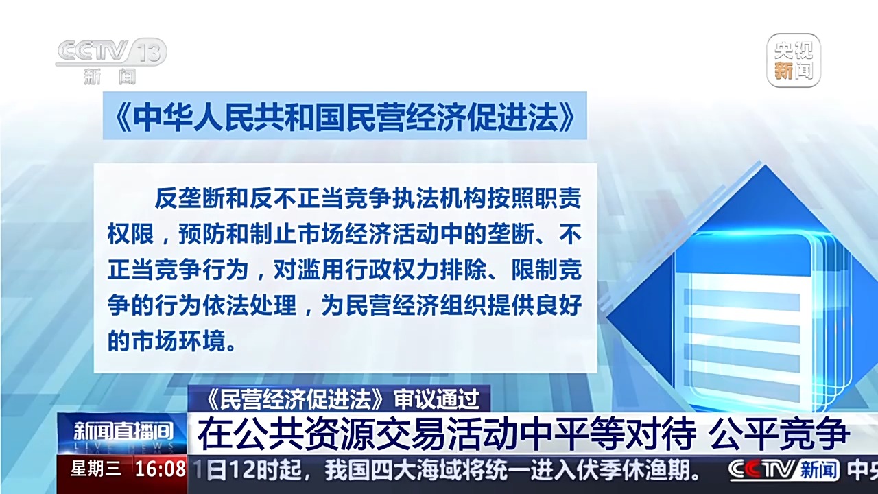 全國人大常委會法工委經(jīng)濟(jì)法室主任 楊合慶:規(guī)定市場準(zhǔn)入負(fù)面清單以外的領(lǐng)域,包括民營經(jīng)濟(jì)組織在內(nèi)的各類經(jīng)濟(jì)組織可以依法平等進(jìn)入;對落實(shí)公平競爭審查制度、定期清理市場準(zhǔn)入壁壘、禁止在公共資源交易活動中限制或者排斥民營經(jīng)濟(jì)組織等作出規(guī)定。