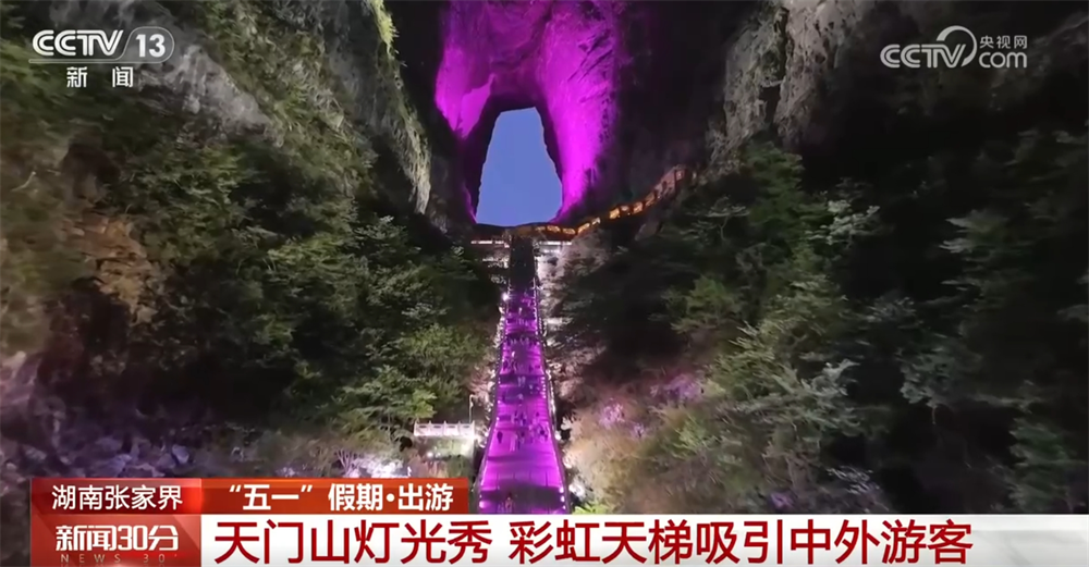 “五一”假期,湖南天門山景區(qū)以自然風光吸引中外游客。隨著夜幕降臨,天門山山體被五彩燈光點亮,999級彩虹臺階燈光流轉(zhuǎn),遠看就像一道連通天地的彩虹橋,將千年奇觀天門洞裝點得更加巍峨壯觀。