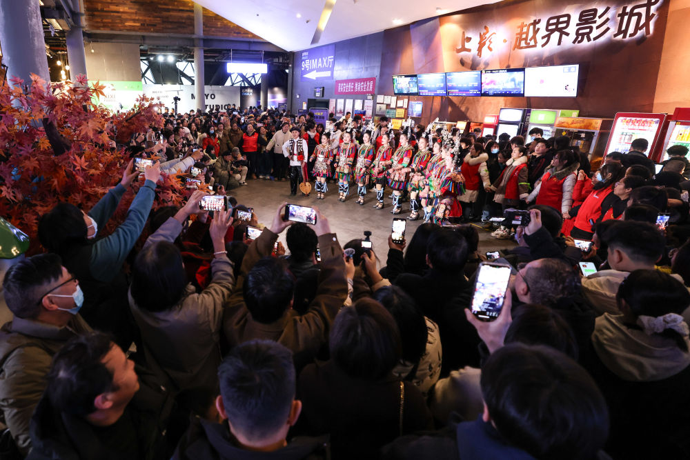2月25日,觀眾在貴陽(yáng)越界影城觀看侗族大歌表演。新華社記者 歐東衢 攝