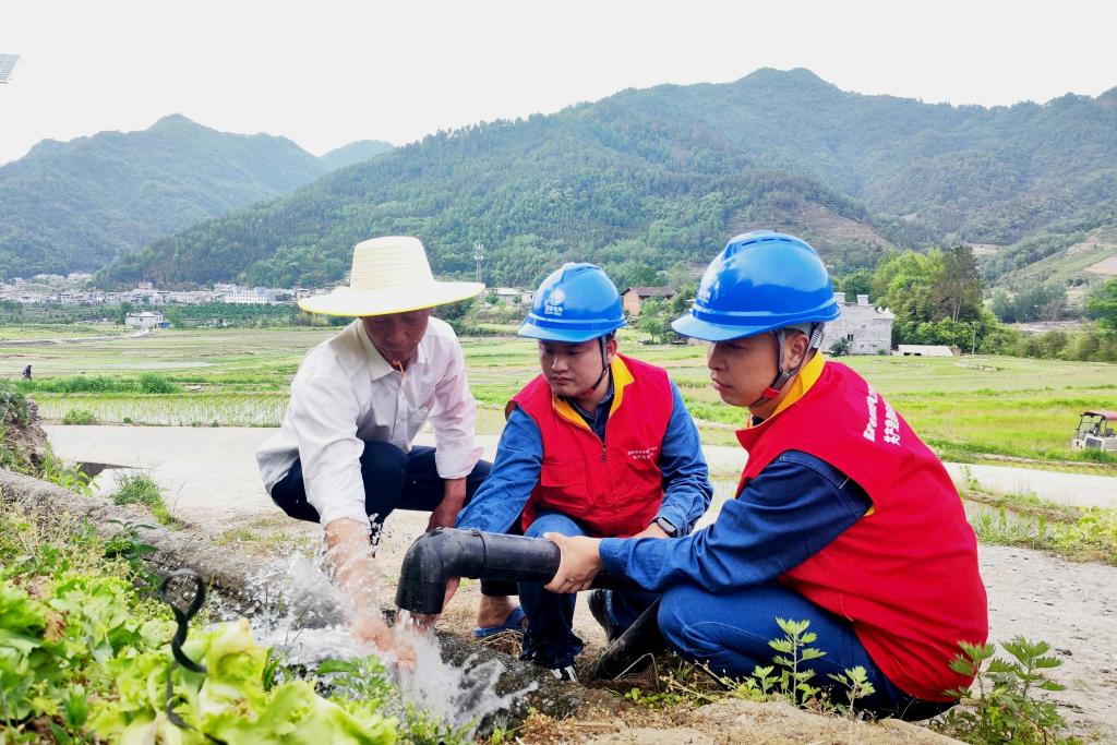 國(guó)家電網(wǎng)陜西省平利縣供電公司黨員服務(wù)隊(duì)在陜西平利縣秋河村幫助農(nóng)戶(hù)調(diào)試抽水水泵。(陳思源 攝)
