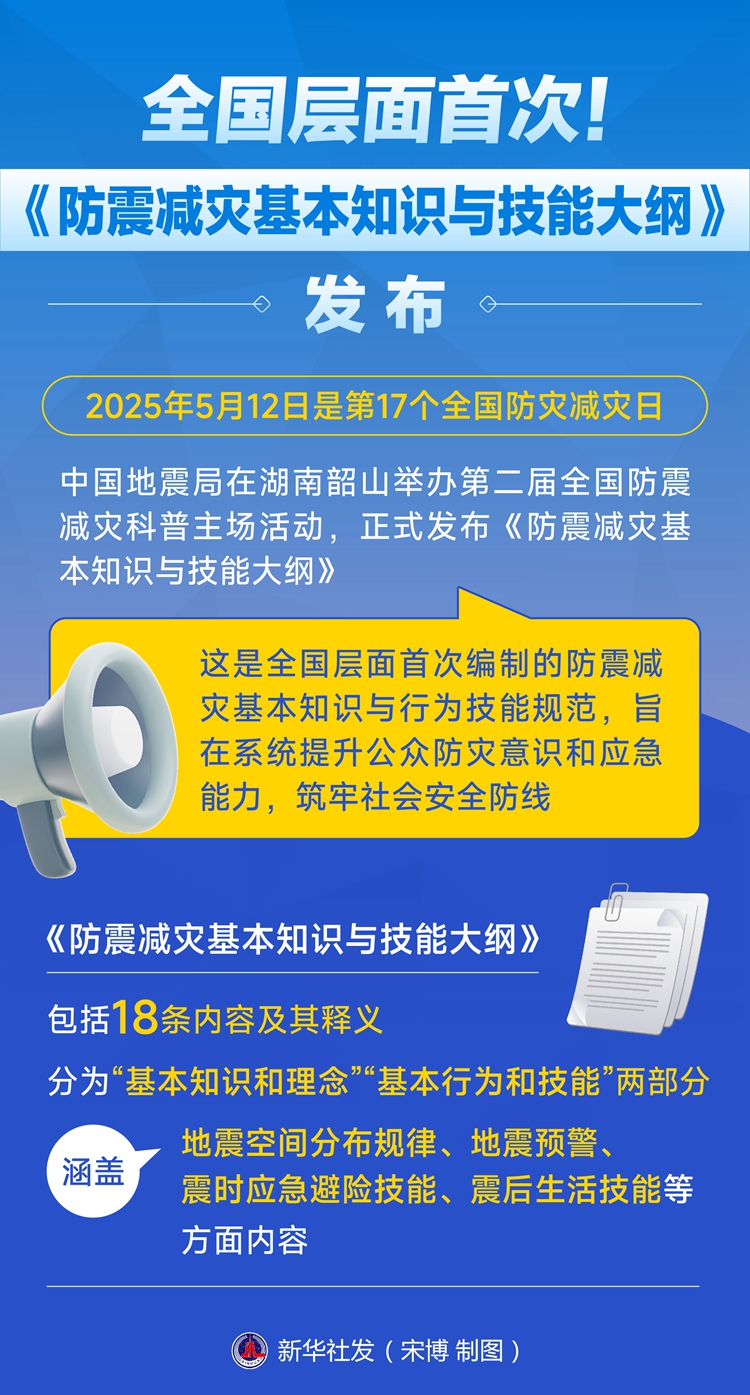 今年5月12日是第17個(gè)全國(guó)防災(zāi)減災(zāi)日。當(dāng)天,中國(guó)地震局在湖南韶山舉辦第二屆全國(guó)防震減災(zāi)科普主場(chǎng)活動(dòng),正式發(fā)布《防震減災(zāi)基本知識(shí)與技能大綱》,這是全國(guó)層面首次編制的防震減災(zāi)基本知識(shí)與行為技能規(guī)范,旨在系統(tǒng)提升公眾防災(zāi)意識(shí)和應(yīng)急能力,筑牢社會(huì)安全防線(xiàn)。