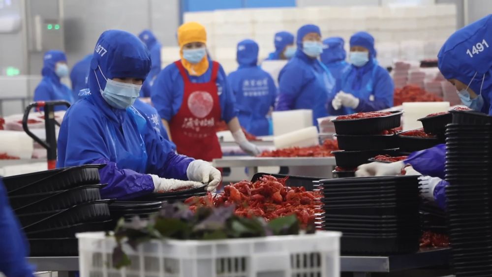 在順祥食品有限公司的現(xiàn)代化小龍蝦加工車間,經(jīng)過清洗、殺菌、分揀、烹飪等十多道工序后,鮮活的小龍蝦被烹制成麻辣、蒜蓉、鮮香等多種口味。每天,數(shù)百噸經(jīng)過急速冷凍的精品龍蝦從這里打包發(fā)往歐洲、東南亞的40多個(gè)國(guó)家和地區(qū)。