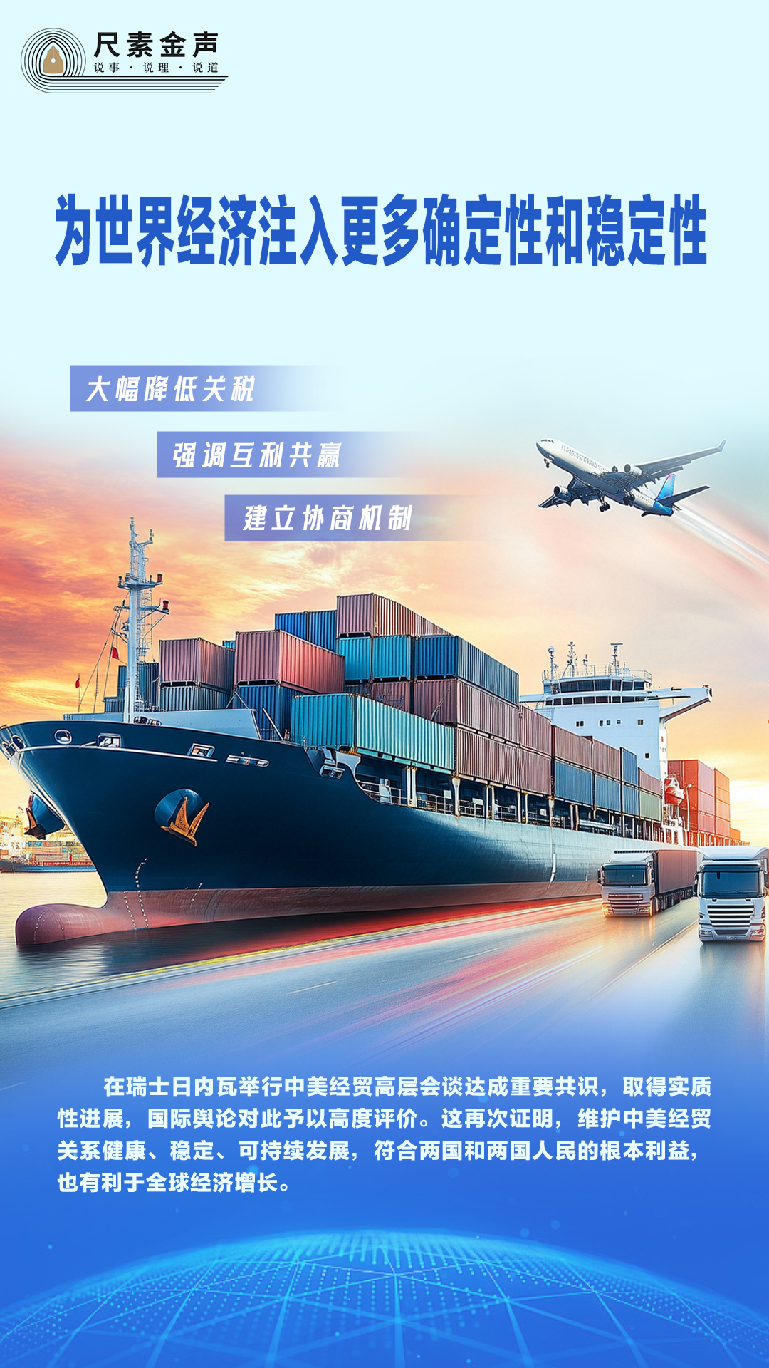 在瑞士日內(nèi)瓦舉行中美經(jīng)貿(mào)高層會(huì)談達(dá)成重要共識(shí),取得實(shí)質(zhì)性進(jìn)展,國(guó)際輿論對(duì)此予以高度評(píng)價(jià)。這再次證明,維護(hù)中美經(jīng)貿(mào)關(guān)系健康、穩(wěn)定、可持續(xù)發(fā)展,符合兩國(guó)和兩國(guó)人民的根本利益,也有利于全球經(jīng)濟(jì)增長(zhǎng)。