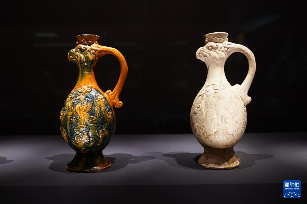 這是在展覽現(xiàn)場(chǎng)拍攝的故宮博物院藏唐代凸花鳳首壺(右)與舊金山亞洲藝術(shù)博物館藏鳳首壺(5月14日攝)。新華社 王申 攝