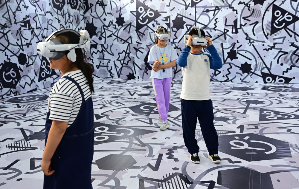 4月26日,小朋友們?cè)诘谌龑弥袊?guó)(安徽)科技創(chuàng)新成果轉(zhuǎn)化交易會(huì)上體驗(yàn)VR設(shè)備。新華社記者 周牧 攝
