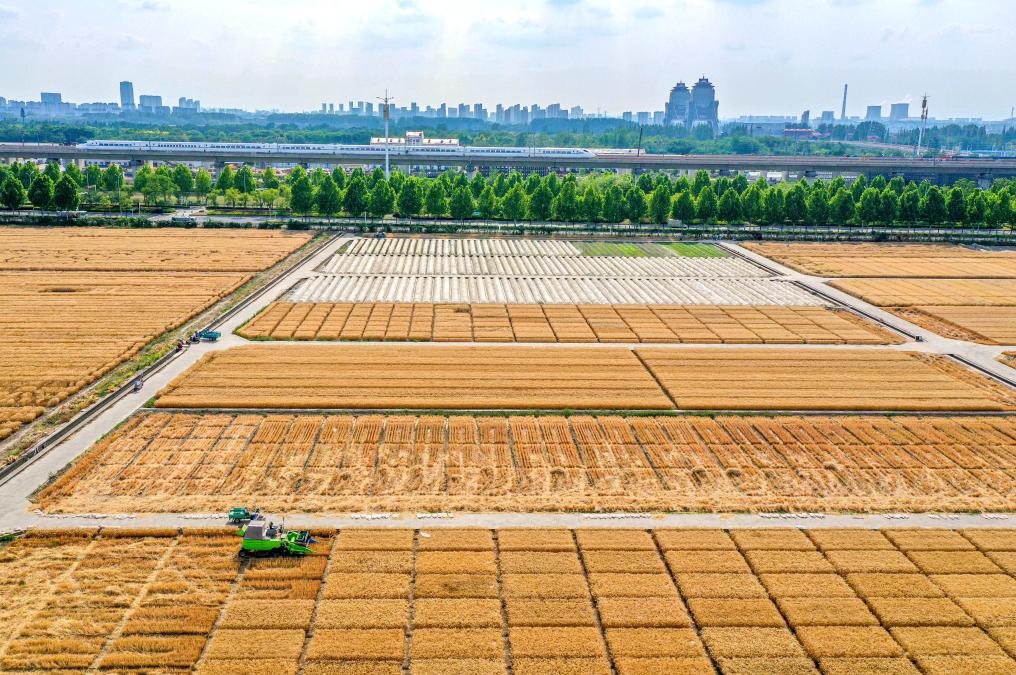 5月20日,在江蘇里下河地區(qū)農(nóng)科所(揚(yáng)州市農(nóng)科院)試驗(yàn)田,農(nóng)民駕駛收割機(jī)收割小麥(無人機(jī)照片)。新華社發(fā)(任飛攝)