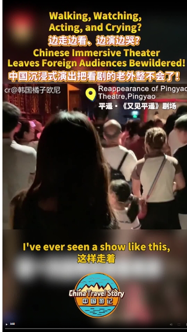在西安《駝鈴傳奇》中,親歷“狼群”環(huán)伺的震撼冒險;走進(jìn)《又見平遙》,踩著青磚“卷入”晉商江湖;去鄭州“只有河南·戲劇幻城”,回到“教室”重拾青春記憶……“感覺到電影里面啦”“太壯觀了”,觀看這些中國沉浸式演出的老外們上一秒還在咧嘴大笑,下一秒就哭成了淚人。