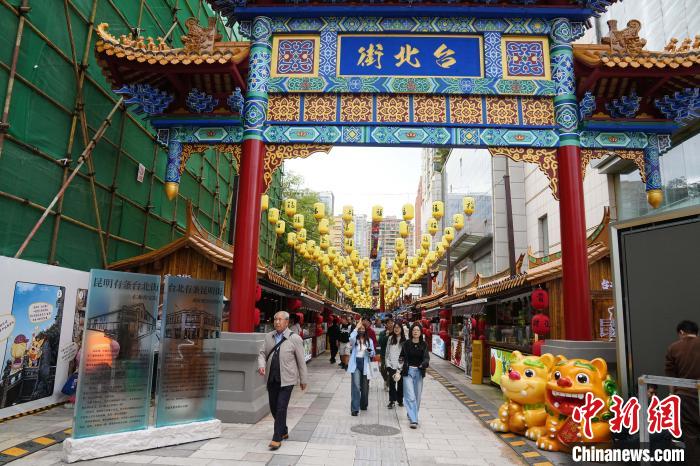 下午3點多,臺北街上已聚集不少食客,大腸包小腸、咸酥雞、旗魚黑輪、愛玉冰等美食琳瑯滿目。放眼望去,融合滇西古建筑特色的牌坊、源于閩南古厝的攤車商亭、來自臺中黃永阜老人的眷村彩繪,讓兩岸同根同源的文脈在此交匯。