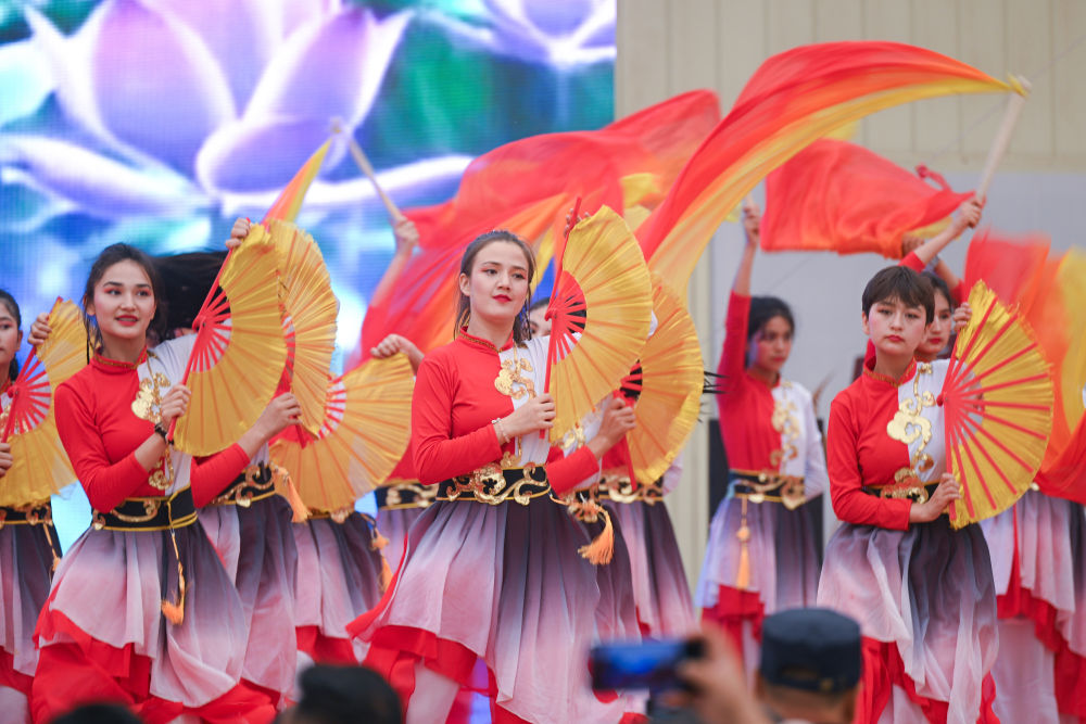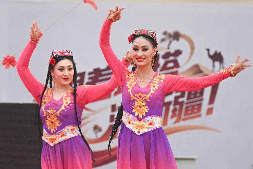 2025年5月28日,演員在2025中國(guó)環(huán)塔國(guó)際拉力賽新疆喀什地區(qū)葉城縣賽段迎賓晚會(huì)上表演。新華社記者 辛悅衛(wèi) 攝