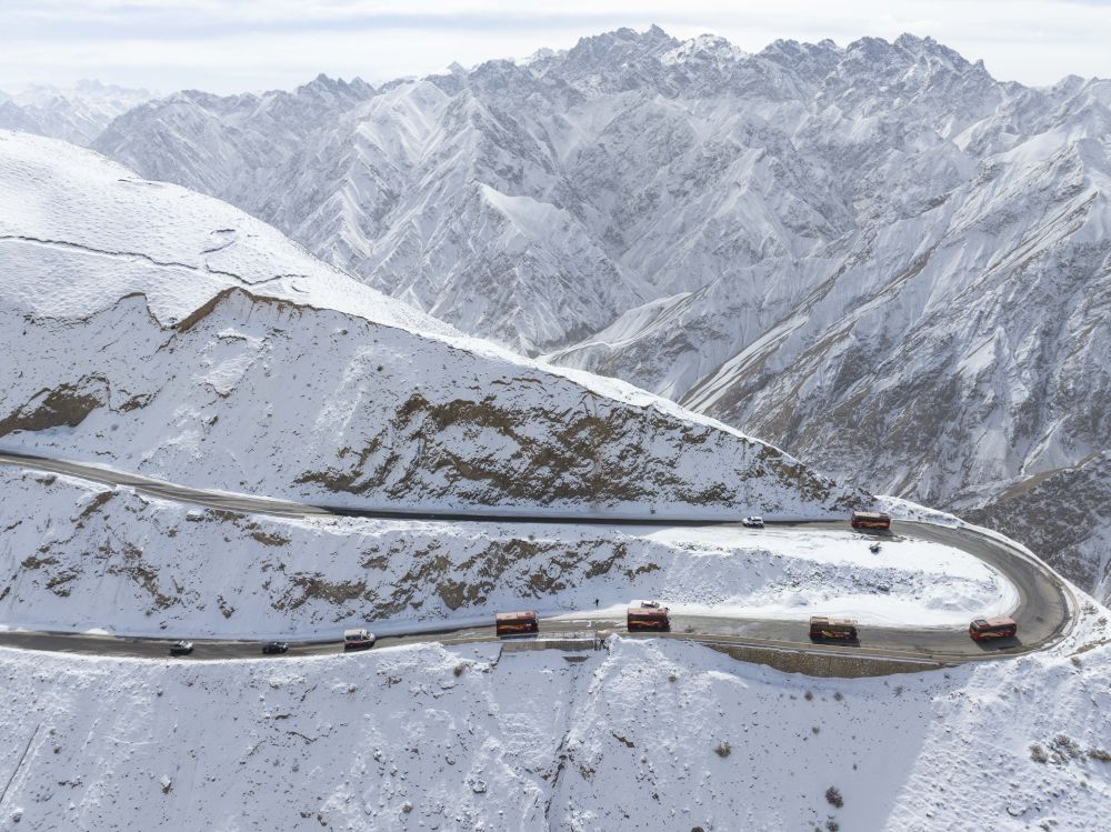 在新疆塔什庫(kù)爾干塔吉克自治縣,參加“盤龍古道”恢復(fù)通車儀式的車隊(duì)在行進(jìn)中(2025年3月22日攝)。新華社記者 徐宏巖 攝