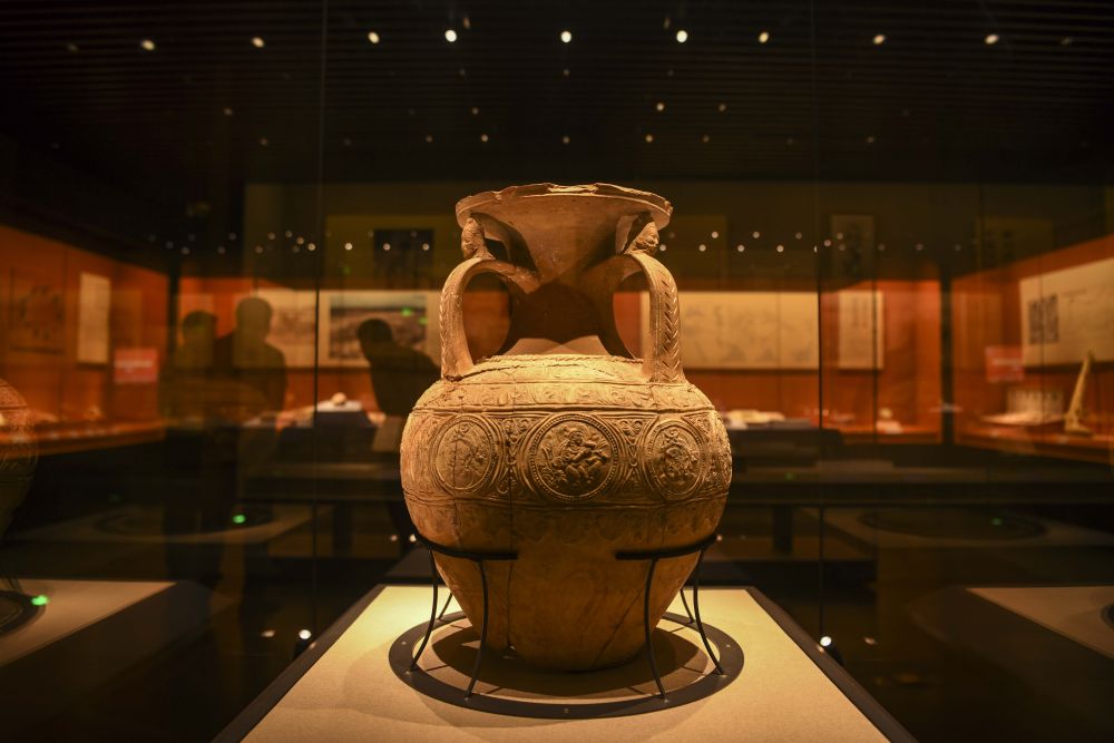 這是在新疆喀什地區(qū)博物館拍攝的國(guó)家一級(jí)文物“三耳壓花陶罐”(2023年6月12日攝)。新華社記者 胡虎虎 攝