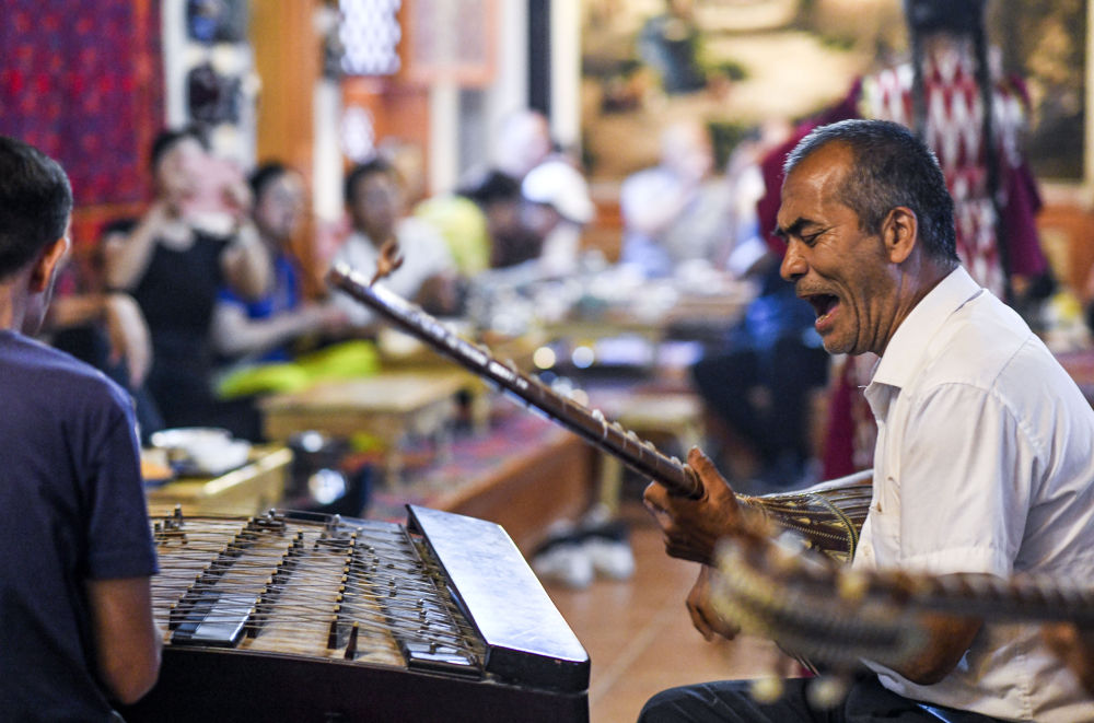 樂(lè)手在新疆喀什古城百年老茶館內(nèi)彈唱(2023年9月15日攝)。新華社記者 王菲 攝