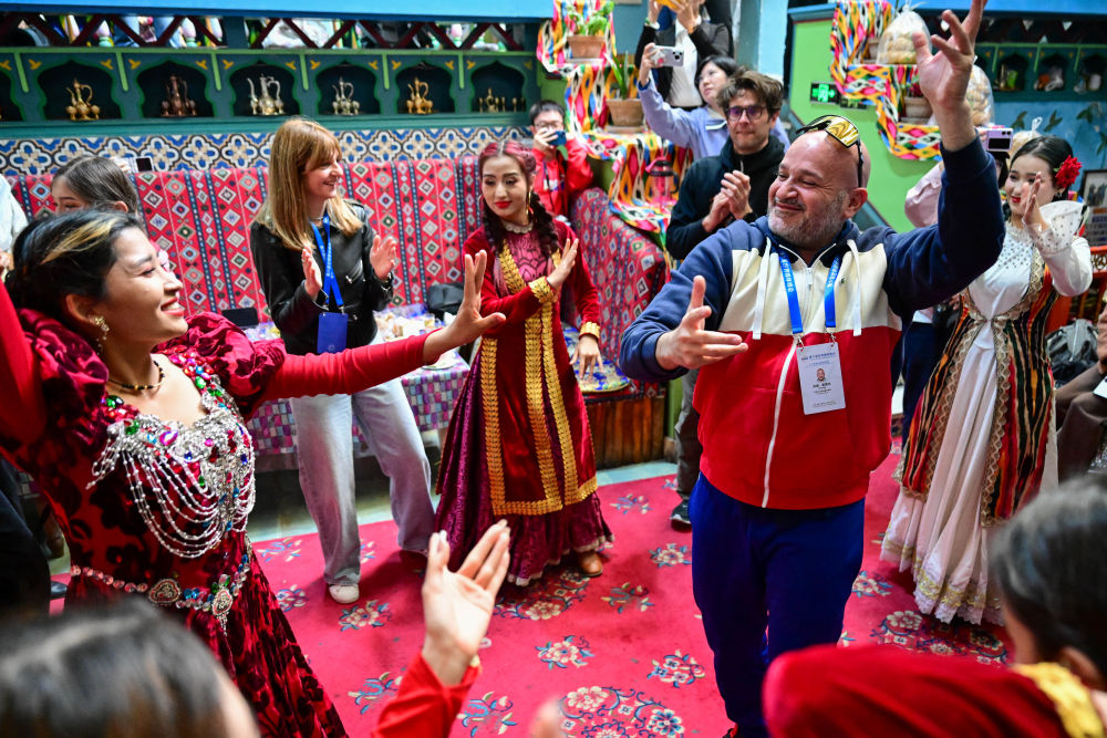 在新疆喀什古城景區(qū)“古麗的家”旅游家訪點(diǎn),第六屆世界媒體峰會(huì)的與會(huì)嘉賓和當(dāng)?shù)鼐用褚黄鹞璧福?024年10月16日攝)。新華社記者 丁磊 攝