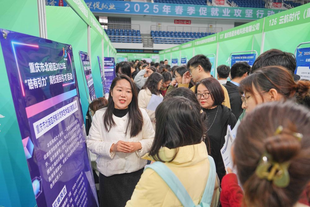 3月28日,西南大學(xué)應(yīng)屆畢業(yè)生在2025年春季促就業(yè)攻堅(jiān)行動(dòng)綜合類雙選會(huì)現(xiàn)場(chǎng)了解崗位信息?;顒?dòng)邀請(qǐng)裝備制造、新能源、數(shù)字信息、綠色化工、基礎(chǔ)教育、醫(yī)療衛(wèi)生等行業(yè)領(lǐng)域企業(yè)參與,為畢業(yè)生搭建廣闊多元的就業(yè)平臺(tái)。新華社發(fā)(秦廷富攝)