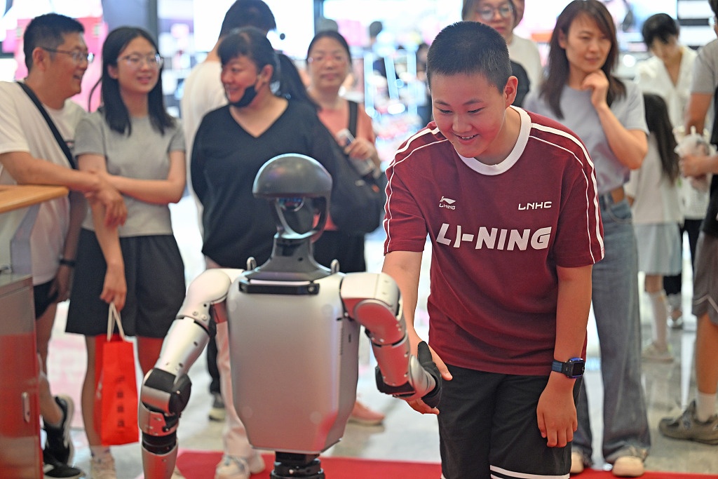 2025年5月2日,湖北宜昌的消費(fèi)者與人形機(jī)器人進(jìn)行互動。