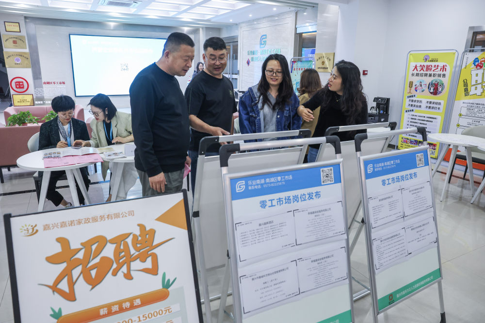 5月8日,在浙江省嘉興市南湖區(qū)零工市場(chǎng)的一場(chǎng)零工招聘會(huì)上,求職者查看各類崗位。新華社記者 徐昱 攝