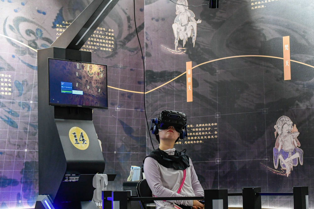 2024年7月22日,游客借助VR設(shè)備沉浸式游覽莫高窟第285窟虛擬場(chǎng)景。新華社記者 郎兵兵 攝