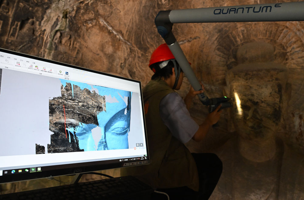 4月9日,武漢大學(xué)文化遺產(chǎn)智能計(jì)算實(shí)驗(yàn)室團(tuán)隊(duì)成員在龍門石窟魏字洞使用關(guān)節(jié)臂掃描儀對(duì)佛像進(jìn)行數(shù)字化掃描。新華社記者 李嘉南 攝