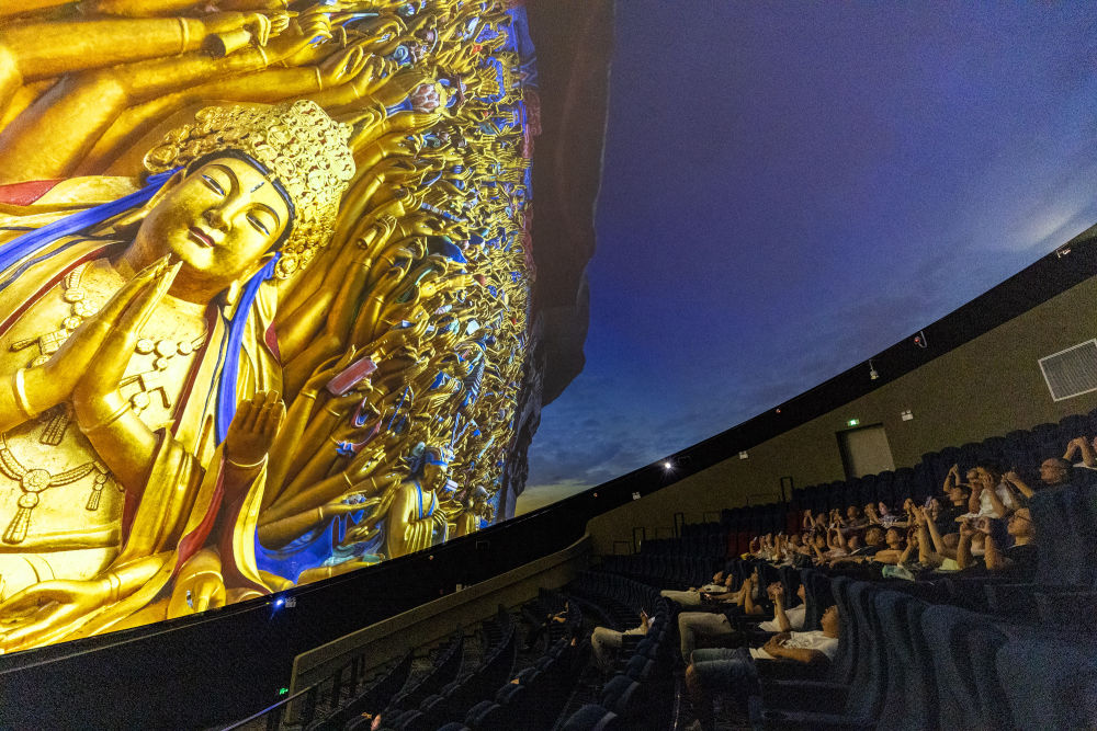 2024年9月27日,游客在重慶大足石刻景區(qū)觀看8K數(shù)字球幕影片《大足石刻》。新華社記者 黃偉 攝