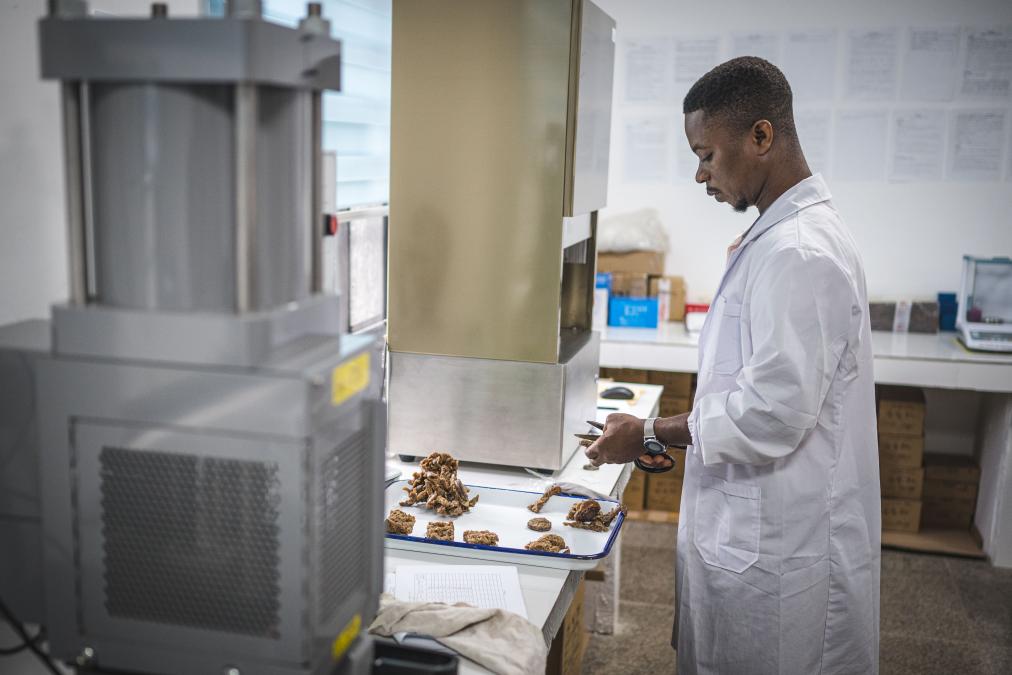 5月30日,在科特迪瓦圣佩德羅省大貝雷比鎮(zhèn),美蘭集團(tuán)橡膠加工廠的技術(shù)人員對橡膠進(jìn)行質(zhì)量測試。新華社記者王冠森攝