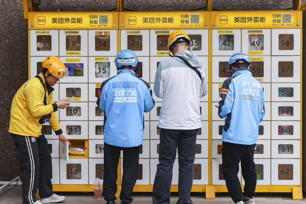 2025年4月22日,江蘇省南京市,外賣員在智能外賣柜前投放餐品。新華社發(fā)(史俊攝)