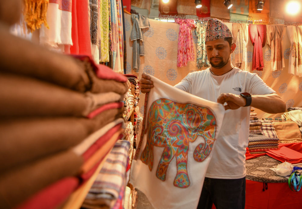 2025年6月18日,在第9屆中國—南亞博覽會,來自尼泊爾的參展商整理即將展出的商品。新華社發(fā)(彭奕凱 攝)