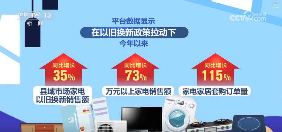 平臺(tái)數(shù)據(jù)顯示,在“以舊換新”政策拉動(dòng)下,2025年以來(lái),縣域市場(chǎng)家電“以舊換新”銷售額同比增長(zhǎng)35%,萬(wàn)元以上家電銷售額同比增長(zhǎng)73%,家電家居套購(gòu)訂單量同比增長(zhǎng)115%。