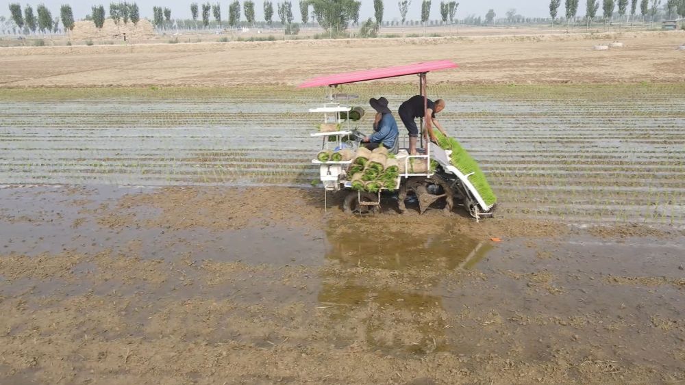在河南省新鄉(xiāng)市原陽縣太平鎮(zhèn),種植戶們在插秧機(jī)的助力下,搶抓農(nóng)時(shí),進(jìn)行水稻插秧。受訪者供圖